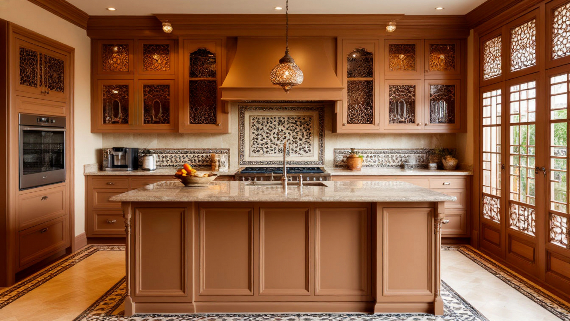 Особое внимание уделено фурнитуре: она незаметна, но именно в этом и заключается её роль. Мягкое и бесшумное закрывание дверок, удобные рукоятки, которые не отвлекают на себя внимание, но обеспечивают приятные тактильные ощущения, аккуратные крепления — всё это формирует внутреннюю логику кухни, где даже самые мелкие элементы работают на общее впечатление качества. Восточный стиль в данном случае выражается не в чрезмерном декоре, а в уважении к мастерству и в стремлении сделать пространство не просто красивым, а мудро продуманным.
