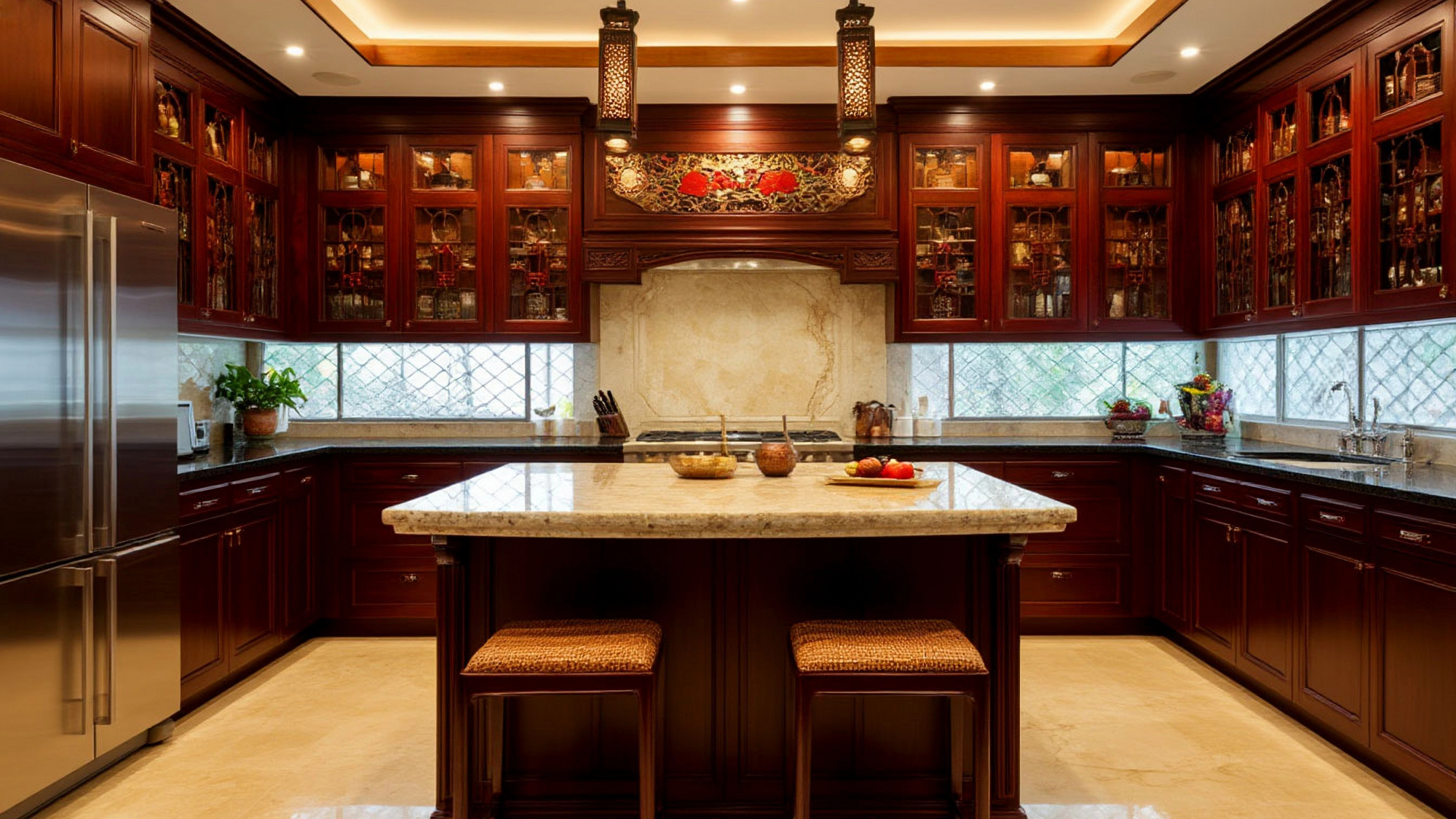 Особое внимание уделено деталям. Аккуратные ручки, выполненные в минималистичном стиле, будто растворяются в фасаде, не нарушая идею чистоты линий. Угловые стыки и кромки обработаны с ювелирной точностью, создавая ощущение монолитности, будто кухня выточена из цельного куска вишнёвого камня. В этом — восточная сдержанность, где форма подчиняется смыслу, а эстетика — функциональности.