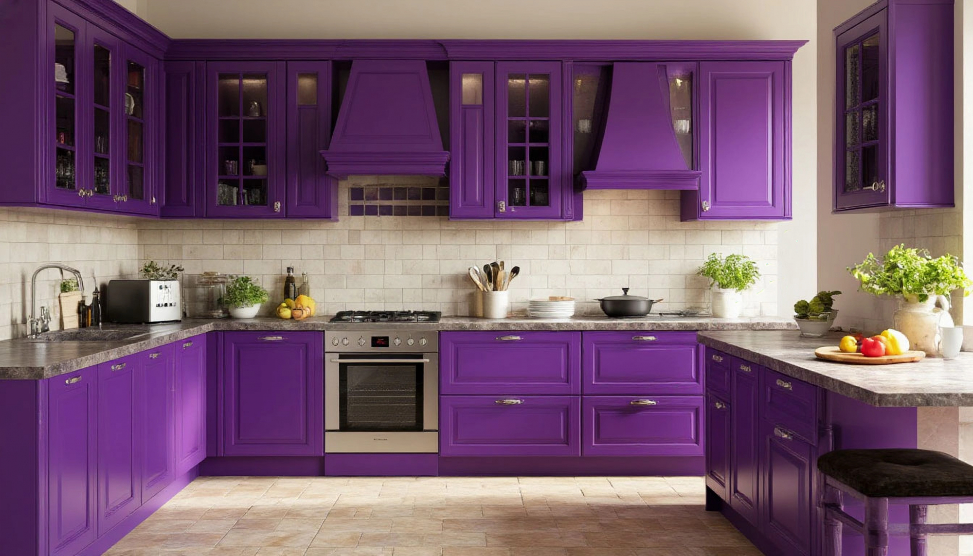 Дизайн кухни отличается гармоничным балансом между классикой и современностью. Итальянский стиль проявляется в пропорциях, деталях, фасадах и фурнитуре, а насыщенный фиолетовый оттенок придает интерьеру динамику и выразительность. Линии кухонного гарнитура чистые и аккуратные, что подчеркивает современный характер, в то время как богатство цвета и декоративные элементы придают пространству теплоту и элегантность. Это позволяет кухне легко интегрироваться в различные интерьерные решения, будь то квартира в современном стиле, загородный дом или апартаменты с открытой планировкой.