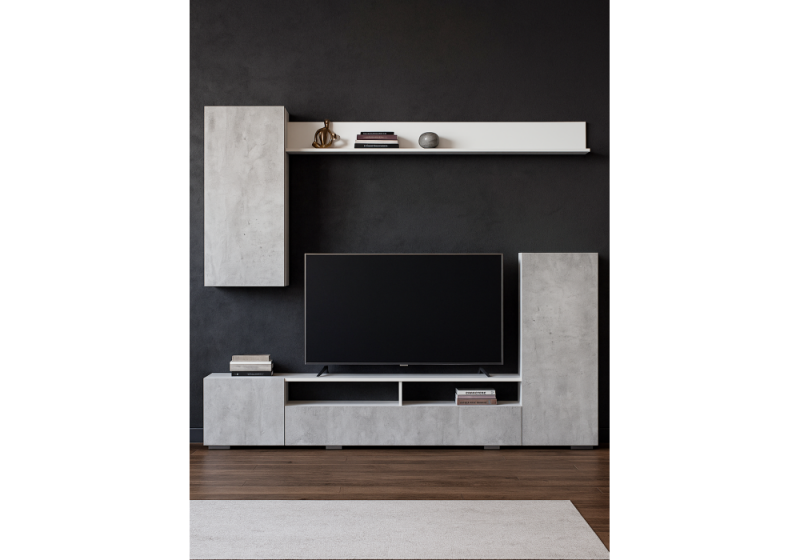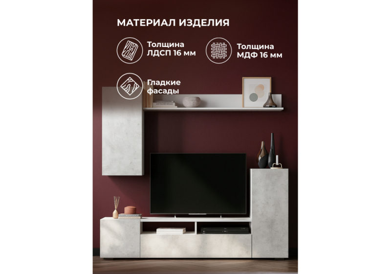 • Центр Развлечений: ТВ-тумба: В основе композиции лежит элегантная и удивительно прочная ТВ-тумба, спроектированная с учетом современных требований к домашним развлечениям. Ее столешница способна выдерживать рекомендуемую равномерную нагрузку до 20 кг, что позволяет разместить практически любой современный телевизор, а также саундбар, игровую консоль, Blu-ray плеер или другие медиа-аксессуары. Продуманное внутреннее пространство тумбы (хоть и не упомянуто детально, подразумевается, что оно есть для хранения) и возможность аккуратной прокладки кабелей помогают создать аккуратный и организованный медиа-центр без видимых проводов, которые могли бы нарушить эстетику.