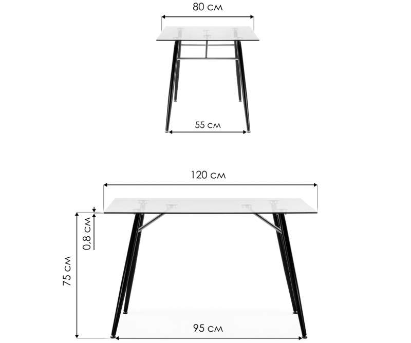 Расстояние между ножками: 95 - 55 см. Толщина столешницы: 0,8 см.